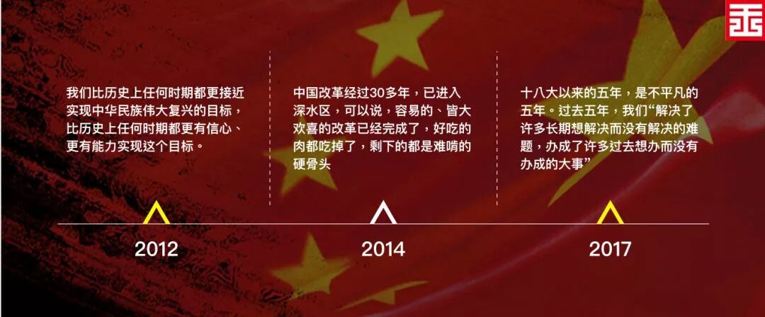 第三句话,在2017年10月份举行的十九大时,在长达三个小时的讲演里漫不经心地这么几句话,可以说是对过去五年的一个交代和总结: